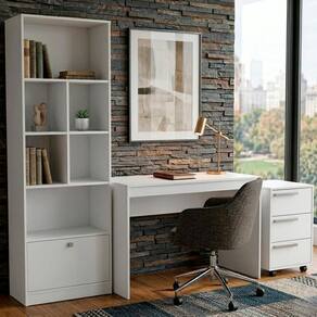 Conjunto de Escritório B31, prático e funcional, desenvolvido para facilitar sua rotina com estilo! Produzido em estrutura MDP de 15 mm e acabamento UV fosco. O Conjunto é composto por mesa escrivaninha com tampo amplo e espaçoso (Suportando até 20 kg distribuídos), estante livreiro com amplos nichos para armazenamento e porta inferior basculante com dobradiças metálicas, além de acompanhar um gaveteiro de 3 gavetas com corrediças metálicas, puxadores em plástico e rodízios para melhor locomoção. NÃO ACOMPANHA ELETRÔNICOS NEM DEMAIS DECORAÇÕES. Este produto será entregue em 3 volumes.