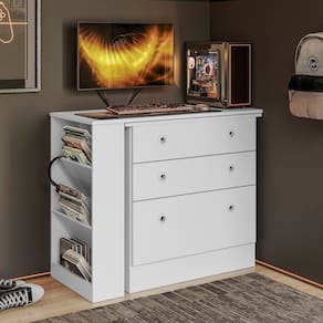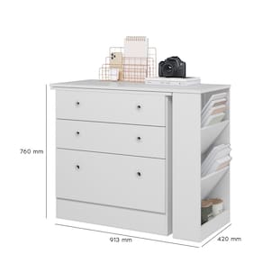 Durante o dia, funciona como uma escrivaninha ampla e confortável para estudos ou home office. À noite, transforma-se em uma cômoda espaçosa com três gavetas, oferecendo praticidade no armazenamento de roupas e objetos pessoais.