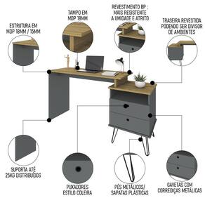 Com toques de estilo industrial expressos pelos pés metálicos, essa mesa para garante durabilidade e resistência, graças ao acabamento BP e tampo de 18mm. Além disso, é uma mesa para home office versátil, pois conta com montagem , o que permite que você escolha entre três opções de tamanho e, ainda, se quer as gavetas do lado direito ou esquerdo, ou seja, você tem liberdade para adequá-la perfeitamente ao seu espaço.