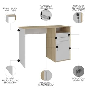 Características do Produto Material da estrutura: MDP 15mm. Material do tampo: MDP 15mm. Acabamento: BP. Escala de Brilho: Fosco. Peso Suportado: 10 kg distribuídos. Quantidade de Portas: 1 Porta. Tipo de Porta: Convencional. Tipo de Dobradiças: Metálicas. Quantidade de Gavetas: 1 Gaveta. Tipo de Corrediças: Telescópicas. Possui Puxador: Sim. Material do Puxador: PS Metalizado. Quantidade de Nichos: 1 Nicho. Tipo de Pés: Sapatas Plásticas. Diferenciais: - Design clássico. - Chave para travamento da gaveta. - Dupla opção de montagem, para lado direito ou esquerdo. Sistema de Montagem: Parafusos/tambor/minifix. Manual de Montagem: Sim. Complexidade da Montagem: Média. Volumes: 1 Volume. Conteúdo da Embalagem: 1 Mesa Escrivaninha. Garantia do Fabricante: 90 dias contra defeito de fabricação. Montagem: Recomendamos que seja feita por um profissional. Recomendação de Limpeza: Utilize pano levemente úmido.