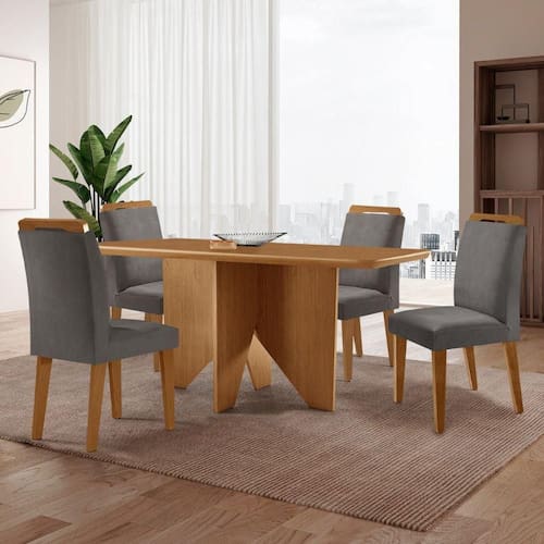Mesa Evora 120 Mdf Com 4 Cadeiras Athenas Veludo Grafite Naturalle Mesa de Jantar Evora 120cm MDF Canto copo e com 4 Cadeiras Athenas A Mesa Evora com as Cadeiras Athenas e uma escolha elegante e moderna para renovar seu ambiente. A mesa se destaca por sua base unica, que confere sofisticacao e um toque de modernidade ao espaco. As Cadeiras Athenas complementam o conjunto com assentos e encostos estofados, proporcionando conforto para longos periodos de uso. O design minimalista das cadeiras e um destaque a parte, alem das alcas no encosto, que acrescentam um charme especial ao conjunto. Essa combinacao e perfeita para quem valoriza estilo e conforto para seu lar.
