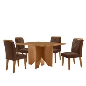 Mesa Evora 90 Mdf Canto Copo E Com 4 Cadeiras Melissa Veludo Marrom Naturalle Mesa de Jantar Evora 90cm MDF Canto copo e com 4 Cadeiras Melissa A Mesa Evora com as Cadeiras Melissa e uma combinacao que exala elegancia e sofisticacao para um espaco compacto. A mesa se destaca por sua base unica, que traz um ar de modernidade ao ambiente. As Cadeiras Melissa complementam o conjunto com assentos e encostos estofados, proporcionando um conforto excepcional para longos periodos de uso. Um detalhe especial sao os bordados no encosto das cadeiras, que acrescentam um charme extra e dao um toque final refinado ao espaco. Essa combinacao e ideal para criar uma atmosfera acolhedora e convidativa para seu lar.