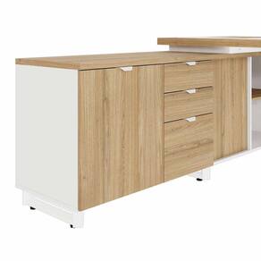 Mesa Executiva 1,80m F5 Office com armário lateral e caixa de tomadas, unindo organização e praticidade.