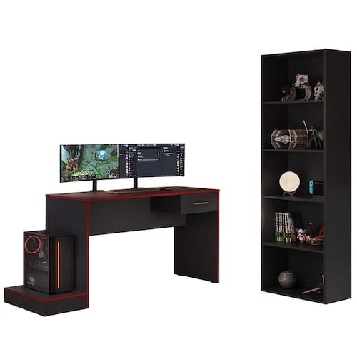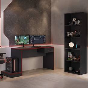 Para quem busca estilo, organização e funcionalidade no setup! Conjunto gamer composto por 02 peças: Mesa Escrivaninha Gamer e Estante Livreiro. A mesa possui estrutura em MDP 15mm, tampo espaçoso com capacidade para até dois monitores (suporta até 10 kg), 1 gaveta com corrediças metálicas e puxador plástico tipo Java, suporte lateral elevado para gabinete (suporta até 10 kg) e sapatas plásticas. O acabamento é feito em pintura UV acetinada com bordas colorida. Já a estante livreiro conta com estrutura em MDP/MDF de 15mm, composta por 05 prateleiras fixas (com suporte de até 5 kg cada), fundo fechado e pés tipo sapatas, em plástico ABS. O acabamento é em pintura UV texturizada (baixo relevo), que proporciona longa durabilidade e facilidade na limpeza. Este conjunto chegará em sua casa separado em 02 volumes.