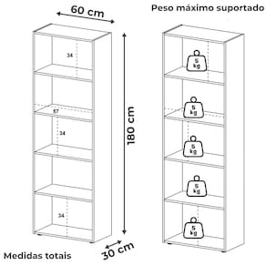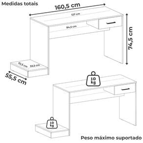 Peso máximo suportado: Mesa 20kg (tampo 10kg/ suporte gabinete 10kg) / Estante 25kg (nichos 05kg cada)