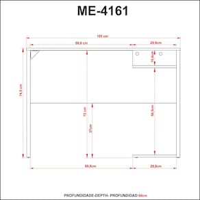 A Mesa Gamer ME4161 é produzida em MDP 15mm e acabamento BP. Possui 2 prateleiras, sendo que a inferior suporta 10kgs e a superior suporta até 5kgs. Possui 1 tampo que suporta até 15kgs. Produto suporta até 30kgs. Conteúdo da embalagem: móvel, ferragens e manual de montagem. A fixação das peças e/ou acessórios é feita por parafusos, cavilhas e minifix. Para uma limpeza mais efetiva, utilizar apenas pano macio umedecido e sabão neutro. Não utilizar produtos abrasivos. Garantia de 03 meses contra defeitos de fabricação. Medidas do produto (AxLxP): 74,5x105x60cm. Peso do produto: 17,3kgs.