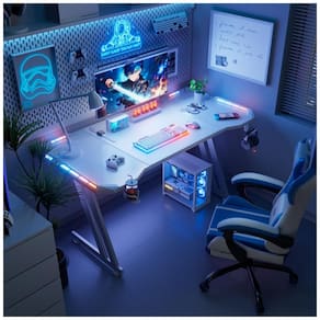 Luzes RGB LED em layout 4x4 com tiras em quatro grupos e conectores PIN universais permitem troca infinita de cores, modos monocromáticos, gradientes e controle por aplicativo, gerando efeitos visuais personalizados. Acessórios incluem suporte para copo extra-grande, gancho para fones e mouse pad oversized, organizando o espaço e evitando desordem no tampo. Design moderno em metal e fibra de carbono para montagem autônoma, com ferramentas completas fornecidas.