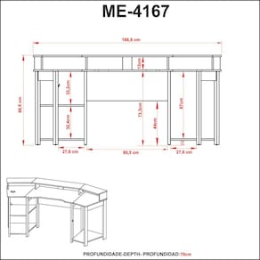 A Mesa Gamer Cockpit Para 2 Monitores ME4167 é produzida em MDP 15mm e acabamento BP. Possui 3 prateleiras que suportam até 10kgs cada. Possui suporte para copo e gancho para headset. Produto suporta até 80kgs. Conteúdo da embalagem: móvel, ferragens e manual de montagem. A fixação das peças e/ou acessórios é feita por parafusos, cavilhas e minifix. Para uma limpeza mais efetiva, utilizar apenas pano macio umedecido e sabão neutro. Não utilizar produtos abrasivos. Garantia de 03 meses contra defeitos de fabricação. Medidas do produto (AxLxP): 89,5x186,6x70cm. Peso do produto: 32kgs.