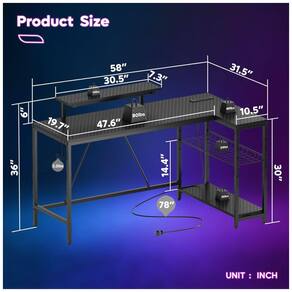A mesa em formato de L da Bestier Gaming é a escolha perfeita para gamers e profissionais que buscam funcionalidade e estilo. Equipado com 3 tomadas CA e 2 portas USB, você pode carregar facilmente seus dispositivos eletrônicos durante o uso. A potência nominal das tomadas CA é de 1500W, com 120V e 12A, enquanto as portas USB fornecem 5V e 2,2A.