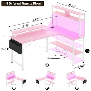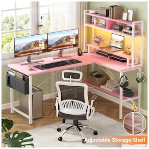 A Mesa Gamer em L Aheaplus oferece estrutura robusta com moldura de metal e tampo em MDF de alta qualidade, resistente à água e fácil de limpar com pano seco. Equipada com 3 tomadas elétricas e 2 portas USB, permite alimentar até 5 dispositivos simultaneamente, como computadores, smartphones e periféricos de jogos. Conta com 4 prateleiras abertas, bolsa de armazenamento extra e gancho para fones, otimizando o espaço para itens diários.