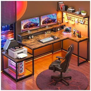 Equipada com tira de LED ajustável instalável na prateleira superior ou sob o monitor, e hub de energia com 3 tomadas AC, porta Type-C e porta adicional para periféricos e dispositivos. Oferece 2 armários laterais, 1 prateleira e suporte ergonômico para monitor, com diagonal de superfície de trabalho de 179 cm. Otimizada para SEO em mesas gamer em L reversíveis com LED, mesas de canto com tomadas elétricas e armazenamento EnHomee.