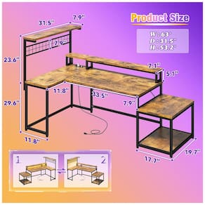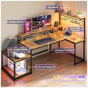 A Mesa Gamer em L EnHomee de 160 cm apresenta layout reversível para instalação em canto esquerdo ou direito, com dimensões de 160 cm de largura por 80 cm de profundidade e altura máxima de 135 cm, adequada para setups gamer ou estações de trabalho em espaços compactos como quartos de jogos ou salas de estudo. Construída com tampo de madeira de 2,5 cm de espessura em acabamento marrom rústico pintado e base metálica fosca, inclui prateleira superior para exibição, grade lateral para armazenamento adicional e suporte lateral para impressora ou torre de PC.