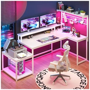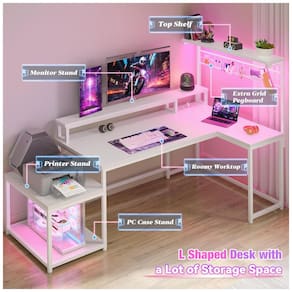 A Mesa Gamer em L EnHomee de 63 polegadas oferece layout reversível configurável para canto esquerdo ou direito, com dimensões de 160 cm de largura por 80 cm de profundidade e altura máxima de 135 cm, ideal para setups gamer ou estações de trabalho em espaços compactos como quartos ou salas de estudo. Construída com tampo de madeira em acabamento pintado branco e base em madeira fosca, inclui prateleira superior para exibição, grade lateral para armazenamento extra e suporte lateral para impressora ou torre de PC.