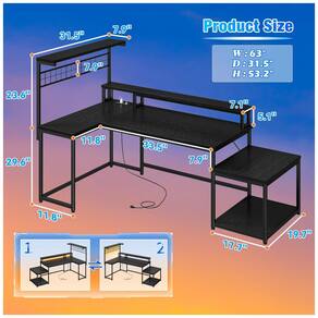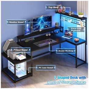 A Mesa Gamer em L EnHomee de 160 cm x 80 cm oferece configuração otimizada para setups de jogos e escritório em casa, com estrutura em formato de L reversível para instalação no lado esquerdo ou direito, adaptando-se a espaços compactos como quartos, salas de jogos ou escritórios. Possui prateleira superior para organização de monitores e acessórios, grade lateral para armazenamento adicional e suporte lateral para impressora ou unidade de computador, totalizando 2 prateleiras abertas e 1 compartimento fechado com 2 portas.