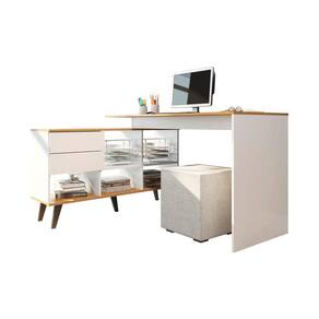 Mesa Home Office Com Estante 145x128cm 2 Gavetas Menu Móveis Branco A Mesa Escrivaninha e um movel util e versatil que promete ser o protagonista do seu ambiente. Dispoe de um design atual que facilita na hora de montar a decoracao, proporcionando um espaco mais aconchegante e organizado. Possui tampo espacoso, perfeito para o home office, alem de estante lateral com duas gavetas e nichos para armazenar seu material de uso diario. O destaque fica por conta dos pes retro, dando um toque unico ao movel. Alem de sua montagem flex que permite montar a estante nos dois lados, se adequando ao espaco disponivel. A mesa e produzida com materiais de excelente qualidade, garantindo a sua durabilidade. O melhor em moveis no design atual aliando conforto, qualidade e otimos precos, so na Menu Moveis! Caracteristicas: Produzida em MDP de 15 mm Acabamento UV Gavetas com Corredica Metalica Puxadores tipo Cava Lateral Pes Retro em Madeira com 18 cm A mesa pode ser montada nos dois lados.