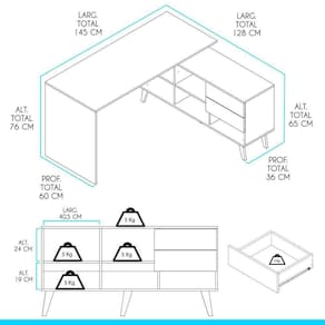 Dimensoes: Altura da Mesa: 76 cm Altura da Estante: 65 cm Largura da Mesa: 145 cm Largura da Estante: 128 cm Profundidade da Mesa: 60 cm Profundidade da Estante: 36 cm Peso: 41,5 kg