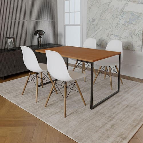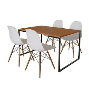 Mesa Industrial Base de Ferro Preto Tampo 137x90 Canela 4 Cadeiras Eames Madeira Assento Branco - Marrom