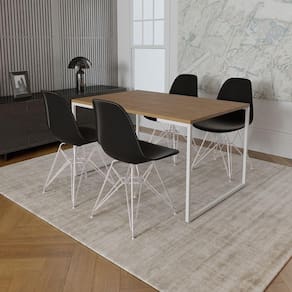 Mesa Industrial Base Ferro Branco Tampo 137x90 Amêndoa 4 Cadeiras Ferro Branco Assento PretoA mesa de jantar é um dos poucos móveis que efetivamente reúne a família para saborear um bom prato ao lado das pessoas que mais ama. E para garantir que o seu ambiente fique impecável, conte com a Mesa De Jantar Industrial e as Cadeiras Eames. Os modelos buscam inspiração no estilo industrial, mas, ao mesmo tempo, abre um leque de possibilidades na hora de colocar a criatividade em prática e fazer as melhores harmonizações para a sua sala de jantar ou cozinha. Distribuindo sofisticação ao cômodo, você ainda pode combiná-la com as outras peças da Linha Industrial para conquistar um visual completo.Tipo: Mesa de Jantar Retangular com 4 CadeirasModelo: Mesa Industrial e Cadeiras EamesInformações MesaCor Base: BrancoCor Tampo: AmêndoaAltura: 78cmLargura: 137cmComprimento: 90cmInformações Cadeira:Pés: Ferro BrancoCor Assento: PretoAltura: 85cmLargura: 47cmComprimento: 50cmATENÇÃOIMAGENS MERAMENTE ILUSTRATIVAS REALIZADO EDIÇÃO, PODENDO HAVER UMA PEQUENA VARIAÇÃO DE COR DEPENDENDO DE CADA TELA OU MONITOR.Mesa Industrial Base Ferro Branco Tampo 137x90 AmÃndoa 4 Cadeiras Ferro Branco Assento Preto
