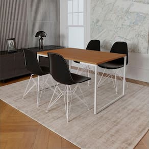 Mesa Industrial Base Ferro Branco Tampo 137x90 Canela 4 Cadeiras Ferro Branco Assento PretoA mesa de jantar é um dos poucos móveis que efetivamente reúne a família para saborear um bom prato ao lado das pessoas que mais ama. E para garantir que o seu ambiente fique impecável, conte com a Mesa De Jantar Industrial e as Cadeiras Eames. Os modelos buscam inspiração no estilo industrial, mas, ao mesmo tempo, abre um leque de possibilidades na hora de colocar a criatividade em prática e fazer as melhores harmonizações para a sua sala de jantar ou cozinha. Distribuindo sofisticação ao cômodo, você ainda pode combiná-la com as outras peças da Linha Industrial para conquistar um visual completo.Tipo: Mesa de Jantar Retangular com 4 CadeirasModelo: Mesa Industrial e Cadeiras EamesInformações MesaCor Base: BrancoCor Tampo: CanelaAltura: 78cmLargura: 137cmComprimento: 90cmInformações Cadeira:Pés: BrancoCor Assento: PretoAltura: 85cmLargura: 47cmComprimento: 50cmATENÇÃOIMAGENS MERAMENTE ILUSTRATIVAS REALIZADO EDIÇÃO, PODENDO HAVER UMA PEQUENA VARIAÇÃO DE COR DEPENDENDO DE CADA TELA OU MONITOR.