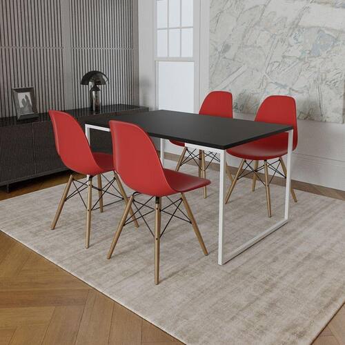 Mesa Industrial Base Ferro Branco Tampo 137x90 Preto 4 Cadeiras Eames Madeira Assento VermelhoA mesa de jantar é um dos poucos móveis que efetivamente reúne a família para saborear um bom prato ao lado das pessoas que mais ama. E para garantir que o seu ambiente fique impecável, conte com a Mesa De Jantar Industrial e as Cadeiras Eames. Os modelos buscam inspiração no estilo industrial, mas, ao mesmo tempo, abre um leque de possibilidades na hora de colocar a criatividade em prática e fazer as melhores harmonizações para a sua sala de jantar ou cozinha. Distribuindo sofisticação ao cômodo, você ainda pode combiná-la com as outras peças da Linha Industrial para conquistar um visual completo.Tipo: Mesa de Jantar Retangular com 4 CadeirasModelo: Mesa Industrial e Cadeiras EamesInformações MesaCor Base: Branco Cor Tampo: PretoAltura: 78cmLargura: 137cmComprimento: 90cmInformações Cadeira:Pés: MadeiraCor Assento: VermelhoAltura: 85cmLargura: 47cmComprimento: 50cmATENÇÃOIMAGENS MERAMENTE ILUSTRATIVAS REALIZADO EDIÇÃO, PODENDO HAVER UMA PEQUENA VARIAÇÃO DE COR DEPENDENDO DE CADA TELA OU MONITOR.Mesa Industrial Base Ferro Branco Tampo 137x90 Preto 4 Cadeiras Eames Madeira Assento Vermelho