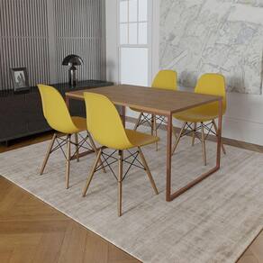 Mesa Industrial Base Ferro Cobre Tampo 137X90 Amêndoa 4 Cadeiras Madeira Assento Amarelo Marrom