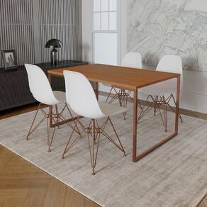 Mesa Industrial Base Ferro Cobre Tampo 137x90 Canela 4 Cadeiras Ferro Cobre Assento Branco A mesa de jantar é um dos poucos móveis que efetivamente reúne a família para saborear um bom prato ao lado das pessoas que mais ama. E para garantir que o seu ambiente fique impecável, conte com a Mesa De Jantar Industrial e as Cadeiras Eames. Os modelos buscam inspiração no estilo industrial, mas, ao mesmo tempo, abre um leque de possibilidades na hora de colocar a criatividade em prática e fazer as melhores harmonizações para a sua sala de jantar ou cozinha. Distribuindo sofisticação ao cômodo, você ainda pode combiná-la com as outras peças da Linha Industrial para conquistar um visual completo.Tipo: Mesa de Jantar Retangular com 4 CadeirasModelo: Mesa Industrial e Cadeiras EamesInformações MesaCor Base: Cobre Cor Tampo: Canela Altura: 78cmLargura: 137cmComprimento: 90cmInformações Cadeira:Pés: Ferro Cobre Cor Assento: BrancoAltura: 85cmLargura: 47cmComprimento: 50cmATENÇÃOIMAGENS MERAMENTE ILUSTRATIVAS REALIZADO EDIÇÃO, PODENDO HAVER UMA PEQUENA VARIAÇÃO DE COR DEPENDENDO DE CADA TELA OU MONITOR.Mesa Industrial Base Ferro Cobre Tampo 137x90 Canela 4 Cadeiras Ferro Cobre Assento Branco