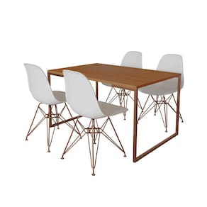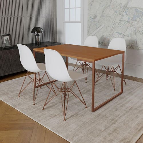 Mesa Industrial Base Ferro Cobre Tampo 137x90 Canela 4 Cadeiras Ferro Cobre Assento Branco A mesa de jantar é um dos poucos móveis que efetivamente reúne a família para saborear um bom prato ao lado das pessoas que mais ama. E para garantir que o seu ambiente fique impecável, conte com a Mesa De Jantar Industrial e as Cadeiras Eames. Os modelos buscam inspiração no estilo industrial, mas, ao mesmo tempo, abre um leque de possibilidades na hora de colocar a criatividade em prática e fazer as melhores harmonizações para a sua sala de jantar ou cozinha. Distribuindo sofisticação ao cômodo, você ainda pode combiná-la com as outras peças da Linha Industrial para conquistar um visual completo.Tipo: Mesa de Jantar Retangular com 4 CadeirasModelo: Mesa Industrial e Cadeiras EamesInformações MesaCor Base: Cobre Cor Tampo: Canela Altura: 78cmLargura: 137cmComprimento: 90cmInformações Cadeira:Pés: Ferro Cobre Cor Assento: BrancoAltura: 85cmLargura: 47cmComprimento: 50cmATENÇÃOIMAGENS MERAMENTE ILUSTRATIVAS REALIZADO EDIÇÃO, PODENDO HAVER UMA PEQUENA VARIAÇÃO DE COR DEPENDENDO DE CADA TELA OU MONITOR. Marca: CASAPRIME