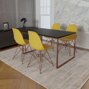Mesa Industrial Base Ferro Cobre Tampo 137x90 Preto 4 Cadeiras Ferro Cobre Assento AmareloA mesa de jantar é um dos poucos móveis que efetivamente reúne a família para saborear um bom prato ao lado das pessoas que mais ama. E para garantir que o seu ambiente fique impecável, conte com a Mesa De Jantar Industrial e as Cadeiras Eames. Os modelos buscam inspiração no estilo industrial, mas, ao mesmo tempo, abre um leque de possibilidades na hora de colocar a criatividade em prática e fazer as melhores harmonizações para a sua sala de jantar ou cozinha. Distribuindo sofisticação ao cômodo, você ainda pode combiná-la com as outras peças da Linha Industrial para conquistar um visual completo.Tipo: Mesa de Jantar Retangular com 4 CadeirasModelo: Mesa Industrial e Cadeiras EamesInformações MesaCor Base: Cobre Cor Tampo: PretoAltura: 78cmLargura: 137cmComprimento: 90cmInformações Cadeira:Pés: Cobre Cor Assento: AmareloAltura: 85cmLargura: 47cmComprimento: 50cmATENÇÃOIMAGENS MERAMENTE ILUSTRATIVAS REALIZADO EDIÇÃO, PODENDO HAVER UMA PEQUENA VARIAÇÃO DE COR DEPENDENDO DE CADA TELA OU MONITOR.Mesa Industrial Base Ferro Cobre Tampo 137x90 Preto 4 Cadeiras Ferro Cobre Assento Amarelo