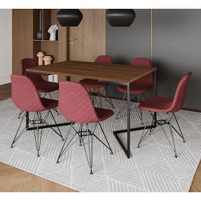 Mesa Industrial Retangular Base V 137x90cm Amêndoa 6 Cadeiras Eames Aço Preto Estofadas Vermelhas - Marrom