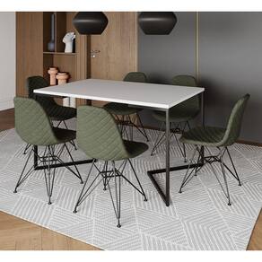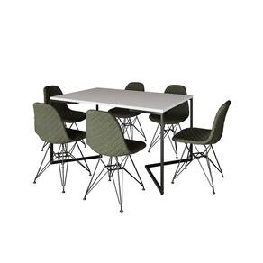 Mesa Industrial Retangular Base V 137x90cm Branca C/ 6 Cadeiras Estofadas Verdes Eiffel Aço Preto - Branco