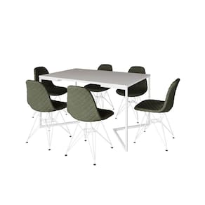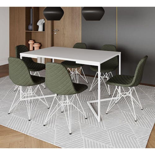 Mesa Industrial Retangular Branca Base V 137x90cm C/ 6 Cadeiras Estofadas Verdes Eiffel Aço Branco