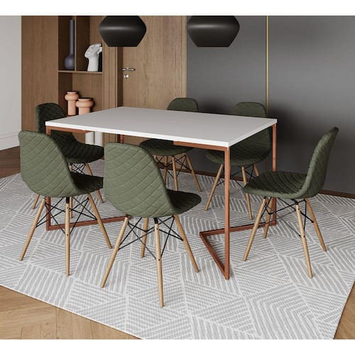 Mesa Industrial Retangular Branca Base V Cobre 137x90cm com 6 Cadeiras Madeira Estofadas Verdes - Branco
