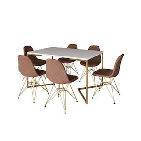 Mesa Industrial Retangular Branca Base V Dourada 137x90cm 6 Cadeiras Estofadas Caramelo Dourada - Branco