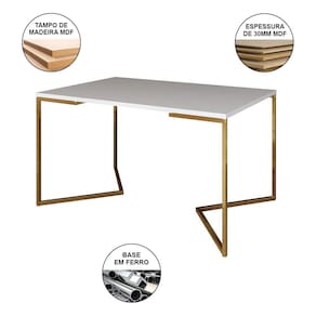 A mesa de jantar é um dos poucos móveis que efetivamente reúne a família para saborear um bom prato ao lado das pessoas que mais ama. E para garantir que o seu ambiente fique impecável, conte com a Mesa De Jantar Industrial. As laterais vazadas, sua forma reta e sua base em V conferem sofisticação e ótimo aproveitamento no cômodo.Tipo: ConjuntoModelo: Industrial Base VCor Tampo Mesa: BrancoCor Base Mesa: DouradoCor Assento Cadeira: CarameloCor Base Cadeira: DouradoMedidas da Mesa:Altura: 78cmComprimento: 90cmLargura: 137cmMedidas da Cadeira:Altura: 85cmLargura: 47cmComprimento: 37cmATENÇÃOIMAGENS MERAMENTE ILUSTRATIVAS REALIZADO EDIÇÃO, PODENDO HAVER UMA PEQUENA VARIAÇÃO DE COR DEPENDENDO DE CADA TELA OU MONITOR.