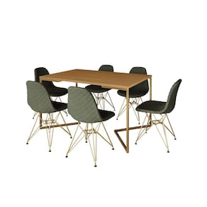 Mesa Industrial Retangular Canela Base V Dourada 137x90cm C/ 6 Cadeiras Estofadas Verdes Dourada - Marrom