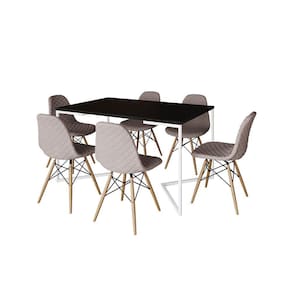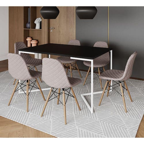 Mesa Industrial Retangular Preta Base V Aço Branco 137x90cm C/ 6 Cadeiras Madeira Estofadas Nude Méd - Preto