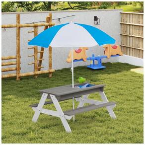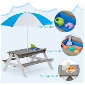 É uma mesa multifuncional projetada para crianças brincarem com areia e água. Além disso, pode ser convertida em uma mesa de piquenique cobrindo os tampos planos da mesa. A mesa tem 2 caixas no tampo para brincar com areia e água, 2 bancos embutidos para acomodar até 4 crianças e guarda chuva ajustável removível para proteger do sol ou da chuva durante as brincadeiras ao ar livre. É uma ótima ideia de presente para crianças que gostam de brincar no quintal, pátio, jardim ou alpendre. A montagem é rápida e fácil, seguindo o livro manual para instalar. A mesa é feita de madeira de cicuta sólida natural bem selecionada, resistente e durável, com acabamento suave de tinta à base de água.