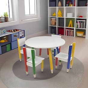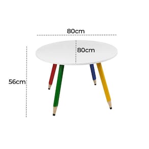 Mesinha Redonda Infantil Pé Lápis Mesa redonda para quartos infantis, brinquedotecas e escolinhas, com tampo 80x80 cm e pés em formato de lápis coloridos (amarelo, verde, vermelho e azul), unindo diversão e praticidade no dia a dia.?
