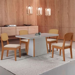 Mesa Jantar Diane 120cm Tampo Mdf Vidro 4 Cadeiras Copper Prem Moderna Veludo Creme Off Serig Mesa Diane com Cadeira Copper Premium A Mesa Diane, produzida em 100 MDF com tampo canto copo e vidro, e a escolha ideal para transformar refeicoes em experiencias memoraveis. Seu design elegante combina perfeitamente estilo e resistencia, garantindo durabilidade sem abrir mao da estetica. A base robusta, com extremidades em acabamento Naturalle, e um verdadeiro destaque visual, agregando charme e sofisticacao ao ambiente. A Cadeira Copper Premium combina design contemporaneo e conforto, com encosto em MDF moldado que proporciona suporte ergonomico ideal. Seu estofado macio garante um assento aconchegante, enquanto o acabamento refinado e os detalhes sofisticados no encosto, que imitam rattan, valorizam seu visual, tornando-a perfeita para ambientes modernos e elegantes. Caracteristicas: Marca: Moderna Mobilia Modelo: Diane / Copper Premium Material: MDF Tampo: Canto Copo com Vidro