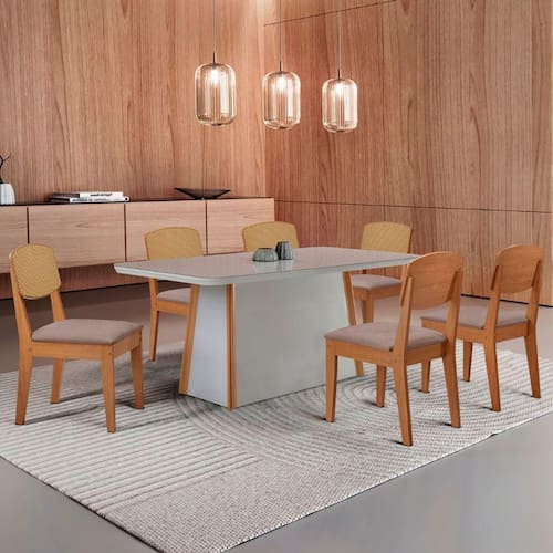 Mesa Jantar Diane 180cm Tampo Mdf Vidro 6 Cadeiras Copper Prem Moderna Linho Capuccino Off Serig Mesa Diane com Cadeira Copper Premium A Mesa Diane, produzida em 100 MDF com tampo canto copo e vidro, e a escolha ideal para transformar refeicoes em experiencias memoraveis. Seu design elegante combina perfeitamente estilo e resistencia, garantindo durabilidade sem abrir mao da estetica. A base robusta, com extremidades em acabamento Naturalle, e um verdadeiro destaque visual, agregando charme e sofisticacao ao ambiente. A Cadeira Copper Premium combina design contemporaneo e conforto, com encosto em MDF moldado que proporciona suporte ergonomico ideal. Seu estofado macio garante um assento aconchegante, enquanto o acabamento refinado e os detalhes sofisticados no encosto, que imitam rattan, valorizam seu visual, tornando-a perfeita para ambientes modernos e elegantes. Caracteristicas: Marca: Moderna Mobilia Modelo: Diane / Copper Premium Material: MDF Tampo: Canto Copo com Vidro