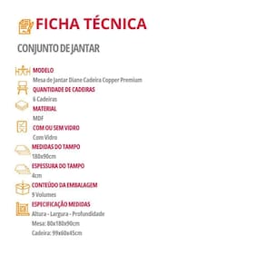 Conteudo da Embalagem: 01 Mesa Diane com Vidro 06 Cadeiras Copper Premium