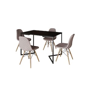 Mesa Jantar Industrial com 4 Cadeiras Estofadas Nude Médio Madeira Tampo Preto 120x75 Base V Aço Pre
