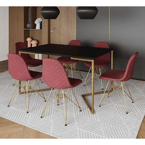A mesa de jantar é um dos poucos móveis que efetivamente reúne a família para saborear um bom prato ao lado das pessoas que mais ama. E para garantir que o seu ambiente fique impecável, conte com a Mesa De Jantar Industrial. As laterais vazadas, sua forma reta e sua base em V conferem sofisticação e ótimo aproveitamento no cômodo.Tipo: ConjuntoModelo: Industrial Base VCor Tampo Mesa: PretoCor Base Mesa: DouradoCor Assento Cadeira: VermelhoCor Base Cadeira: DouradoMedidas da Mesa:Altura: 78cmComprimento: 90cmLargura: 137cmMedidas da Cadeira:Altura: 85cmLargura: 47cmComprimento: 37cmATENÇÃOIMAGENS MERAMENTE ILUSTRATIVAS REALIZADO EDIÇÃO, PODENDO HAVER UMA PEQUENA VARIAÇÃO DE COR DEPENDENDO DE CADA TELA OU MONITOR.