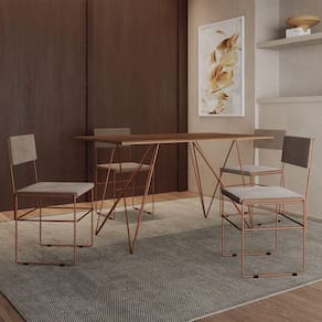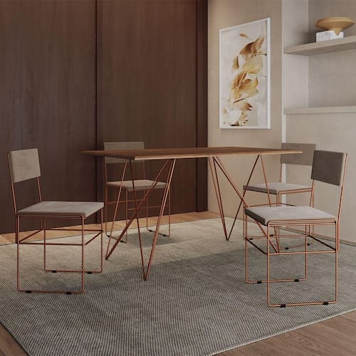 IMAGENS MERAMENTE ILUSTRATIVAS REALIZADO EDIÇÃO, PODENDO HAVER UMA PEQUENA VARIAÇÃO DE COR DEPENDENDO DE CADA TELA OU MONITOR.Mesa Jantar Industrial Trama 1,40x0,80m AmÃndoa Com 4 Cadeiras Estofadas VitÃria Bege E Cobre