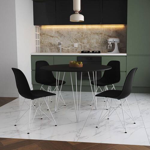 A Mesa de Jantar Redonda Clips com as Cadeiras Eiffel é a escolha perfeita para você que está em busca de um produto sofisticado e muito versátil! O Conjunto possui o diferencial de ser um produto compacto e prático, podendo ser incorporado facilmente nos mais diversos ambientes, como: cozinhas, restaurantes, varandas ou até áreas de festas!CaracterísticasTipo: Conjunto Mesa e 4 CadeirasModelo: ClipsCor do Tampo: PretoCor do Assento: PretoBase Ferro: BrancoDIMENSÕES DO PRODUTOCadeira:Altura: 85cmLargura: 47cmComprimento: 50cmMesa:Altura: 85cmDiâmetro: 110cmATENÇÃOAS IMAGENS SÃO MERAMENTE ILUSTRATIVAS E PODEM SOFRER VARIAÇÕES DE COR E PEQUENOS DETALHES DE ACORDO COM O SEU MONITOR, ILUMINAÇÃO DO AMBIENTE E ATÉ MESMO A SUA PERCEPÇÃO VISUAL.Mesa Jantar Redonda 110cm Preta Clips 3 PÃs com 4 Cadeiras Eames Eiffel Pretas Ferro Branco