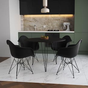 A Mesa de Jantar Redonda Clips com as Poltronas Eiffel é a escolha perfeita para você que está em busca de um produto sofisticado e muito versátil! O Conjunto possui o diferencial de ser um produto compacto e prático, podendo ser incorporado facilmente nos mais diversos ambientes, como: cozinhas, restaurantes, varandas ou até áreas de festas!CaracterísticasTipo: Conjunto Mesa e 4 PoltronasModelo: ClipsCor do Tampo: PretoCor do Assento: PretoBase Ferro: PretoDIMENSÕES DO PRODUTOPoltrona:Altura: 80cmLargura: 38cmComprimento: 38cmMesa:Altura: 85cmDiâmetro: 90cmATENÇÃOAS IMAGENS SÃO MERAMENTE ILUSTRATIVAS E PODEM SOFRER VARIAÇÕES DE COR E PEQUENOS DETALHES DE ACORDO COM O SEU MONITOR, ILUMINAÇÃO DO AMBIENTE E ATÉ MESMO A SUA PERCEPÇÃO VISUAL. Mesa Jantar Redonda 90cm Preta Clips 3 PÃs com 4 Poltronas Eiffel Eames Daw Pretas Ferro Preto