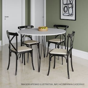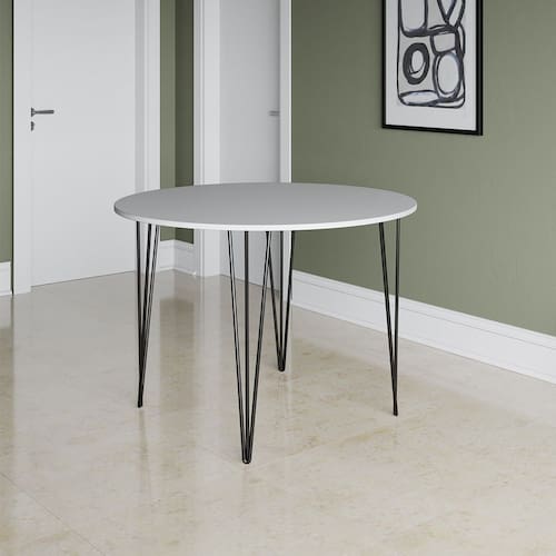 Mesa Jantar Redonda Branca Hairpin 110cm Elen Base Ferro Preto A sua cozinha ou sala de jantar só está completa com uma boa mesa para reunir a família e amigos, se você busca um móvel de qualidade e com combinação de cores, o modelo Elen é para você! Com tampo redondo e estrutura em ferro, ela acomoda os seus convidados enquanto complementa a decoração com sofisticação e qualidade.