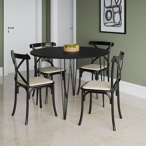 Mesa Jantar Redonda Preta Elen 110cm Hairpin Com 4 Cadeiras Katrina Preta - Cor: Preto