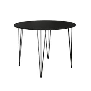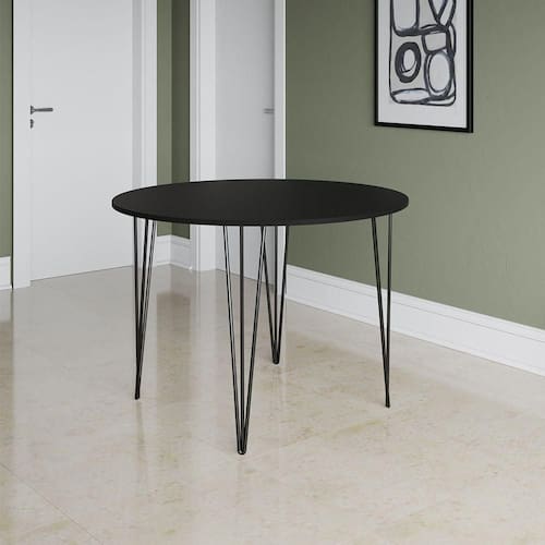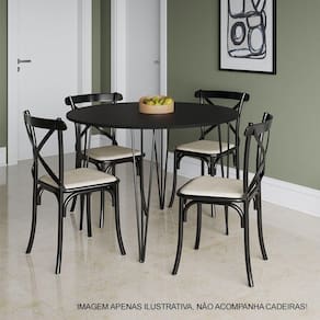 Mesa Jantar Redonda Preta Hairpin 110cm Elen Base Ferro Preto - Cor: Preto Mesa Jantar Redonda Preta Hairpin 110cm Elen Base Ferro PretoA sua cozinha ou sala de jantar só está completa com uma boa mesa para reunir a família e amigos, se você busca um móvel de qualidade e com combinação de cores, o modelo Elen é para você! Com tampo redondo e estrutura em ferro, ela acomoda os seus convidados enquanto complementa a decoração com sofisticação e qualidade.Tipo: Mesa RedondaModelo: ElenCor Tampo: PretoBase: PretoProduto Acompanha: 1 Mesa Elen (cadeira vendido separadamente)Medidas:Altura: 76cmDiâmetro: 110cmATENÇÃOIMAGENS MERAMENTE ILUSTRATIVAS, PODENDO HAVER UMA PEQUENA VARIAÇÃO DE COR DEPENDENDO DE CADA TELA OU MONITOR. NÃO ACOMPANHA CADEIRAS.Mesa Jantar Redonda Preta Hairpin 110cm Elen Base Ferro Preto