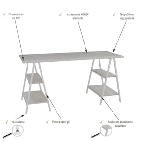 Mesa Kuadra Cavalete 150x60x75cm Snow / Snow / Sobre o ProdutoMesa Kuadra Cavalete 150X60X75cm Carvalho / Est.BrancaDescrição do Produto:A Mesa Cavalete KUMC6150 é um produto prático e versátil, que pode ser utilizado em diversos ambientes, como quarto e escritório, na sala, cozinha ou seu depó Linha Kuadra tem seu design com inspiração no estilo industrial, que remete muito a decoração usada nos Lofts das grandes metrópoles nos anos 60 e 70. Harmonizando o metal e os tons de madeira, foram projetados móveis versáteis e com estilo, que podem compor ambientes íveis cheios de personalidade, perfeitos para você decorar sua casa ou seu trabalho, tendo um resultado que caminha do estilo rústico ao Inclusos:1 MesaDimensões dos Produtos:Mesa Kuadra Cavalete 150X60X75cm Carvalho / 150 x 60 x 75 cmInformações Logísticas (Comp. X Prof. X Alt.) 155 x 64,5 x 7 cm - Peso: 26,784 KgPeso Total: 26,784 KgObservações:Não acompanha acessórios decorativos. Imagens meramente ilustrativas.Informações Técnicas / Características:- Cor do Produto: Carvalho / - Marca: Compace- Modelo: KUMC6150- Linha: Kuadra- Material: Mdp- Material da Estrutura / Pés: Aço- Acabamento: BP Acetinado- Escala de Brilho: Fosco- Fita de Borda: Pvc - Possui Gavetas: Não - Possui Prateleiras: 4- Peso Máximo por Prateleira: 5- Possui Pés: 2- Pés Niveladores: Sim - Acabamento Estrutura: Epóxi-Pó Texturizado- Formato: Retangular - Suporta Até (kg): 50 kg- Comprimento: 150cm- Profundidade: 60cm- Altura: 75cm - Peso Lí.: 25,79Kg- Recomendações de Uso, Manutenção e Limpeza: Para a limpeza, utilize flanela seca ou pano macio levemente umedecido em água. Utilize um pano seco em seguida. Evite com produtos químicos (solventes, thinner, acetona, etc) e não utilize nenhum tipo de esponja de aço.- Necessita de Montagem: Sim / Acompanha Manual de Montagem- Complexidade da Montagem: Média: pode ser montado por mais de uma pessoa e/ou necessite de maior conhecimento para montagem.- Garantia: 6 meses Material: Mdp | Acabamento: BP Acetinado | Escala de Brilho: Fosco | Fita de Borda: Pvc | Material da Estrutura: Aço | Acabamento da Estrutura: Epóxi-Pó Texturizado | Marca: Compace | Modelo: Mesa de escritório | Produto: Mesa | Cômodo indicado: Escritórios | Cor: Multicolorido | Tonalidade: Multicolorido | Profundidade: 60 | Altura: 75 | Comprimento: 150 | Fabricante: Compace | Coleção: Industrial | Requer Baterias: Não | Certificação Externa: | Componentes inclusos: Manual de montagem e kit acessórios | Preço de tabela: | Compace: do Modelo | 1: da Peça | KUMC6150: | Base da Mesa: | Duração da Garantia: | Dimensões do Produto (A x L x C), sem a caixa de embalagem: | Tipo de Mesa: | País de Origem: | Coleção de Antiguidade: | Montagem: | Móvel Dobrável: | Desing da Escrivaninha: | Recursos da Mesa: | Recursos da Escrivaninha: | Tipo de Garantia: | Produto personalizado: | de Assentos: | Tamanho Do Pacote: | Temas de Estampas: | Motivo de Isenção Anvisa: | Formato do Espelho: | Código Anvisa do Produto: | Shape: | Nr. do Lote do Produto: | Data de validade Anvisa: | Altura da Mesa: | Formato da Escrivaninha: | Qtd. de Produto no Lote: | Funcionalidades: | Estilo: | Quantidade: Cor: Snow /